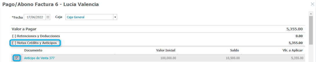 En la nueva ventana, indicas la fecha en la cual se realiza la aplicación del documento, seleccionas el anticipo y verificas el valor a aplicar y el que queda pendiente.