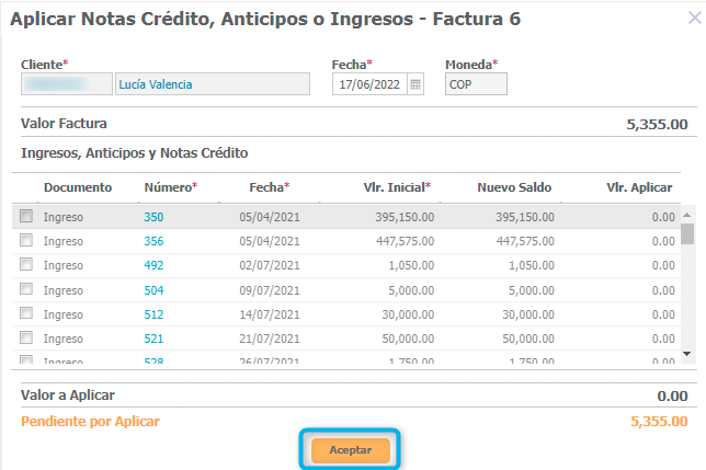 El saldo que ingresaste quedará relacionado en el campo Saldo por Aplicar COP.