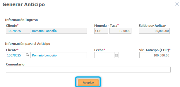 Al hacer esto debes indicar la Fecha en la cual se generó el Anticipo. Además, tienes la posibilidad de cambiar el Valor del Anticipo (de acuerdo al total del ingreso) o adicionar un comentario si lo requieres.