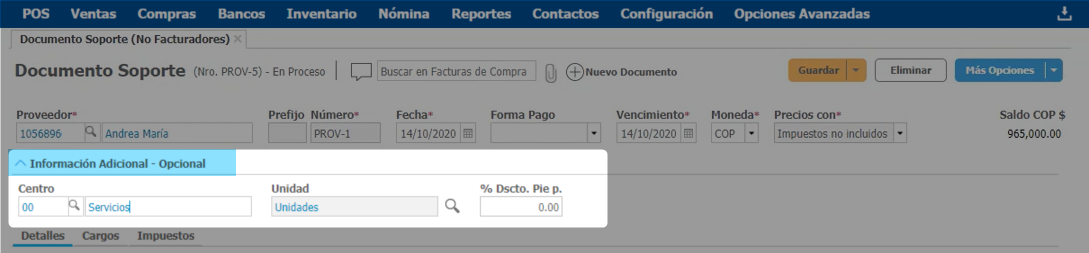 Nota: Si la empresa maneja centros, es importante que establezcas dicha información desde el desplegable de Información Adicional - Opcional.