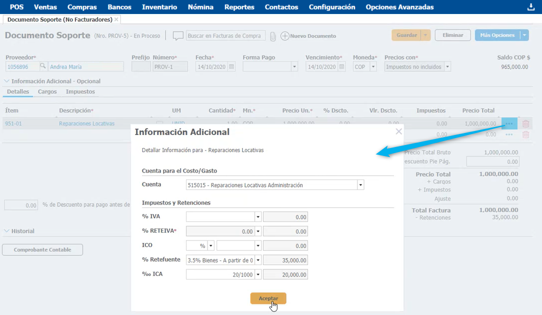 tienes la posibilidad de modificar o adicionar algún impuesto si lo requieres, para nuestro ejemplo adicionaremos el cálculo de ICA.