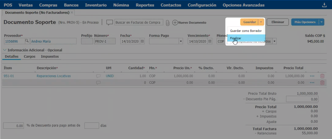 Al finalizar, el documento pasa a estado Por Pagar.