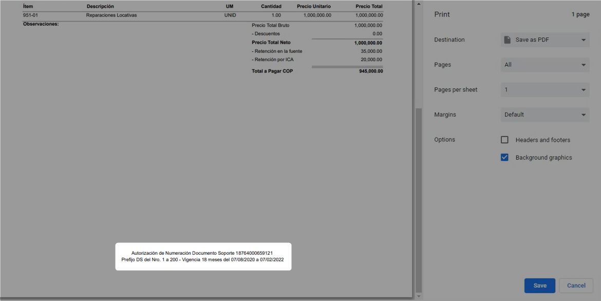 Al dar clic en Imprimir puedes verificar el formado del Documento Soporte como se muestra en el ejemplo: