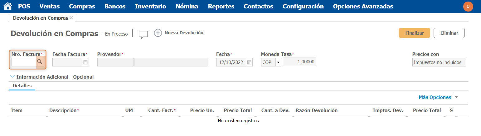 En la nueva ventana debes seleccionar el documento soporte al cual le vas a generar la devolución, desde el campo de Nro. Factura y diligenciar los campos respectivos.