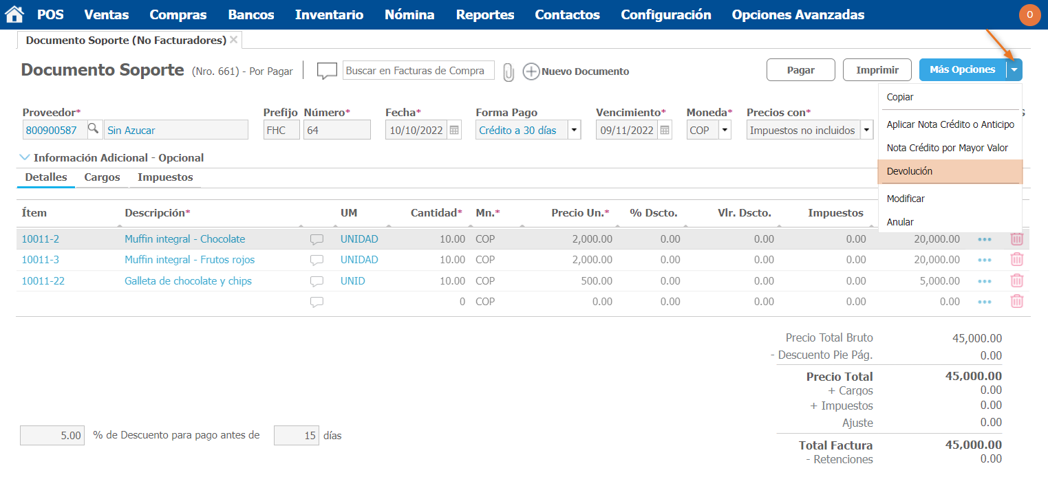 Para registrar una devolución desde un Documento Soporte puedes hacerlo por 2 rutas:
