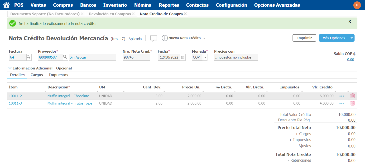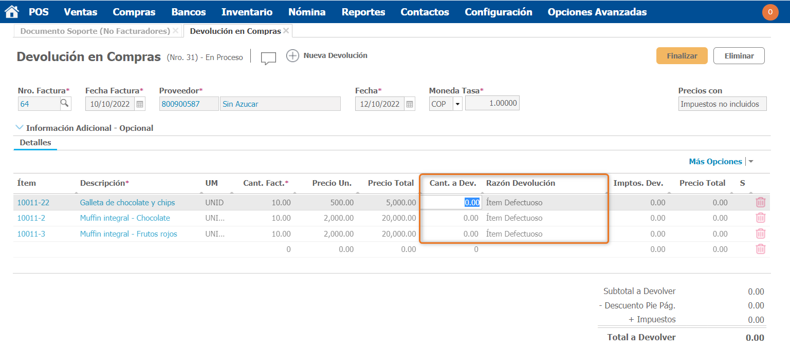 Si para algún producto del documento soporte no se generó devolución puedes dejar en valor en cero (0.00) cómo se muestra en nuestro ejemplo con las galletas de chocolate: