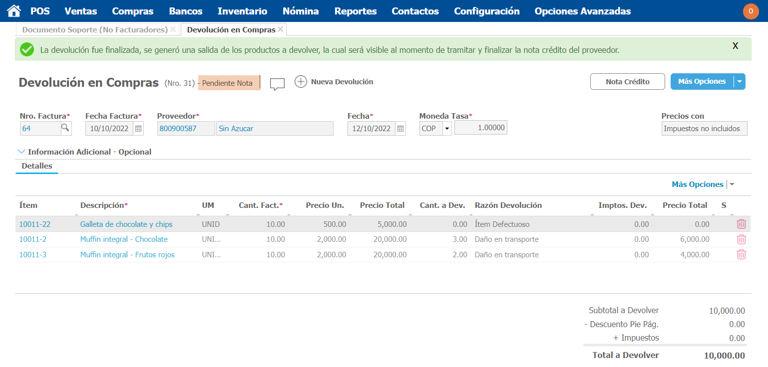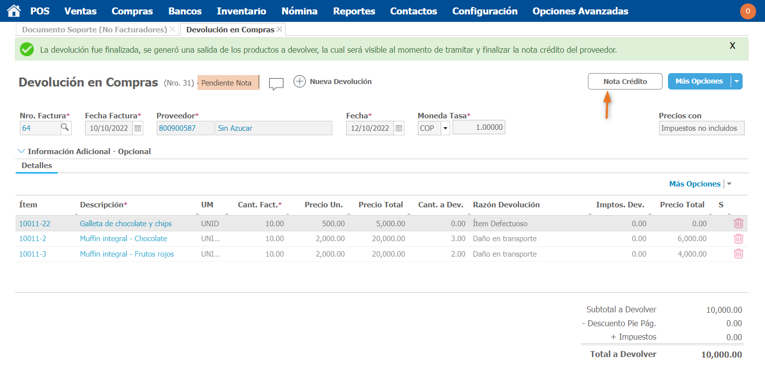 Cómo generar devolución de mercancía desde un documento soporte - Loggro Pymes