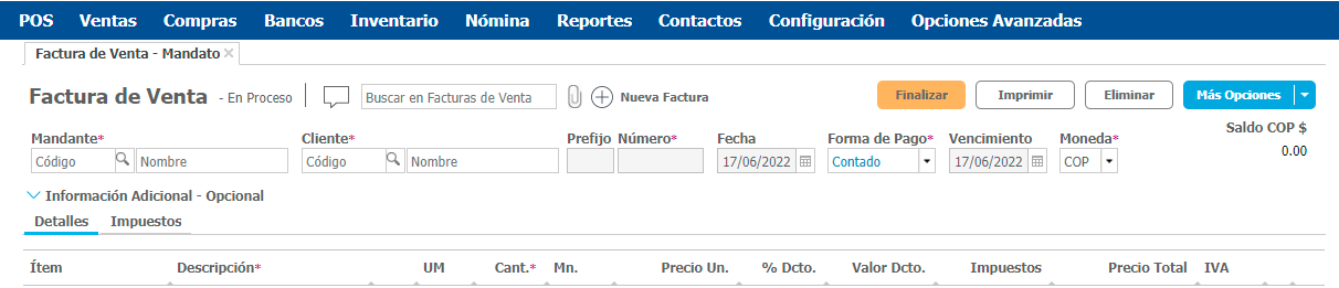 Diligencia los datos de la factura (el mandante, el cliente y el producto o servicio de ingresos para terceros). El contacto que indiques como Mandante debe estar creado en el sistema como un Cliente, con sus responsabilidades fiscales definidas ya que los impuestos y retenciones se aplican según el mandante y el cliente.