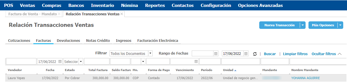 Para consultar las facturas de venta por mandato registradas en el sistema ingresa por la ruta Ventas → Relación Transacciones Ventas en la sección Facturas