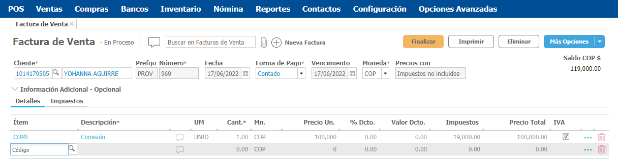 La factura por las comisiones la realizas ingresando a Ventas → Factura de venta