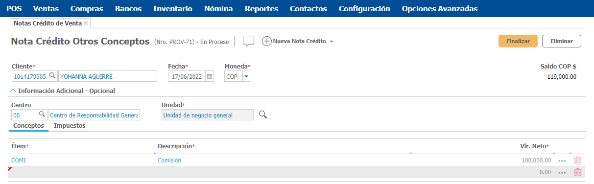 - Realizando una Nota Crédito por Otros Conceptos para cruzar los saldos de ingresos para terceros. La nota crédito la generas por Ventas → Notas Crédito de Venta. Allí despliegas el menú de Nueva Nota Crédito y seleccionas Otros Conceptos.