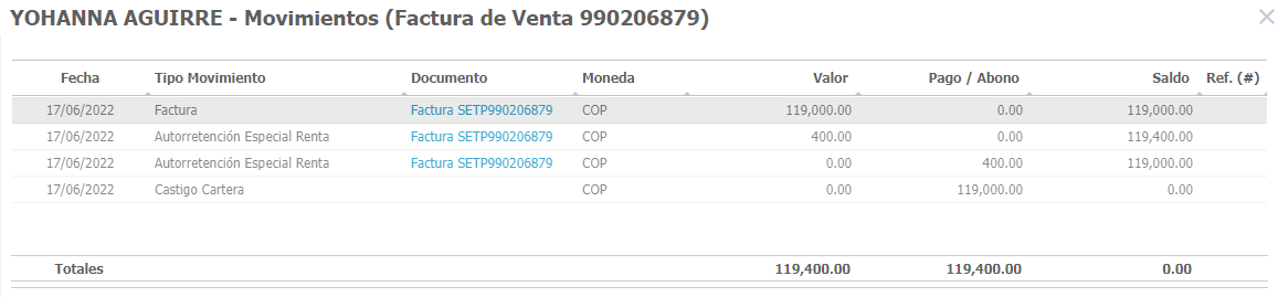 Al dar clic en el saldo del documento puedes verificar que a este se le realizó un castigo.