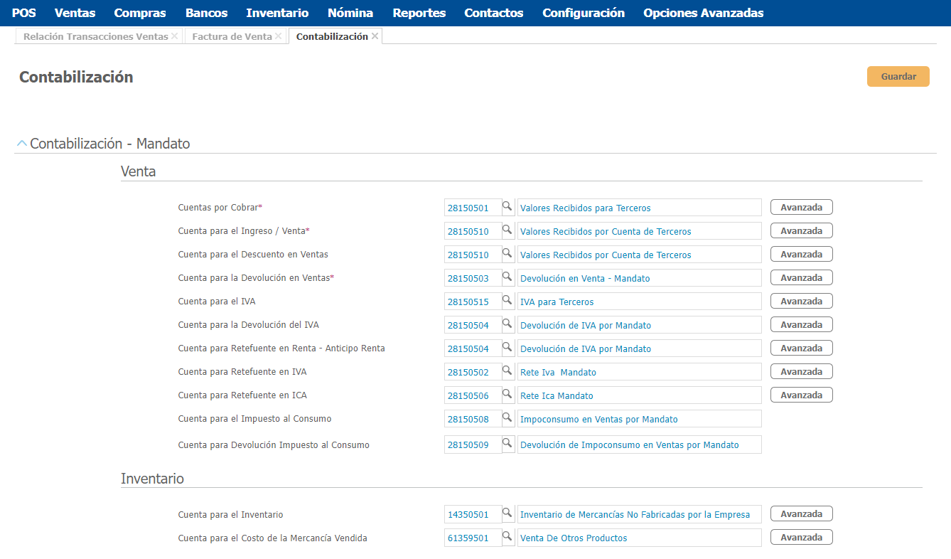 Si vas a manejar Facturación por Mandato en Loggro, debes definir la contabilización especifica que tendrán estos documentos. Esto con el fin que los documentos electrónicos (por mandato) se puedan finalizar correctamente y se realicen los movimientos contables.