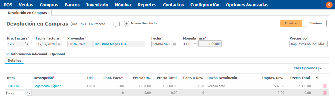 La devolución la puedes generar directamente desde la factura de compra por el botón Más Opciones → Devolución o puedes ingresar por la ruta Compras → Devolución en Compras