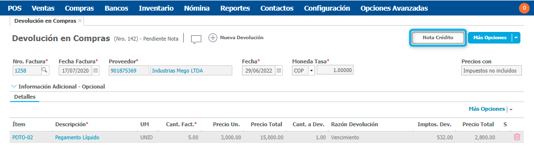 Al dar clic en Aceptar, el sistema te muestra la devolución en estado Pendiente Nota, solo debes dar clic en el botón Nota Crédito para continuar el proceso.