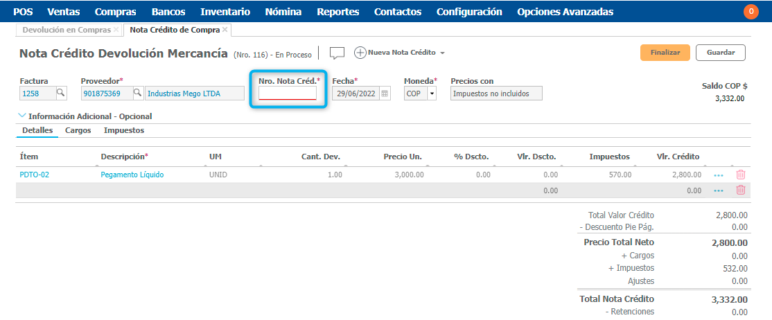 El sistema te muestra el formato de la Nota Crédito por Devolución de Mercancía y debes ingresar el número del documento.