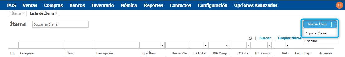 - Puedes ingresar a la opción directamente desde Inventario → Lista de ítems ó Configuración → Lista de ítems. Y desde la lista de ítems despliega el menú Nuevo Ítem y selecciona Importar Ítems
