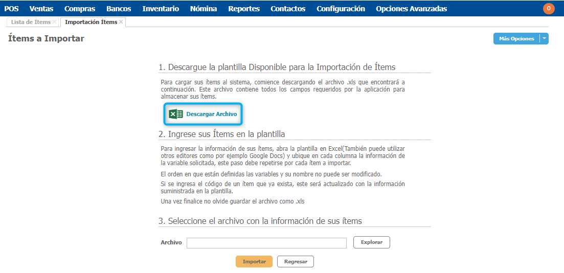 Debes dar clic en el botón Explorar y ubicar el archivo que guardaste con la información de los ítems a cargar, luego de esto das clic en Importar.