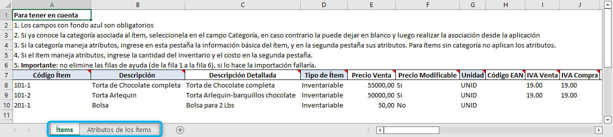 Al descargar la plantilla encontrarás el archivo en formato de Excel, que cuenta con 2 hojas de calculo: Ítems y Atributos de los Ítems, la plantilla debe tener esta misma estructura cuando vayas a cargarla por lo cual no debes eliminar ninguna de estas hojas de trabajo.