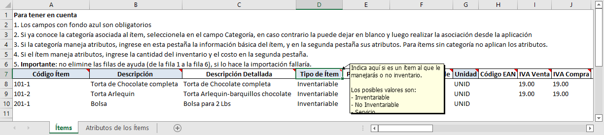 - El campo de Categoría toma las creadas en Loggro, si creas una nueva categoría y vas a cargar ítems por importación debes descargar nuevamente la plantilla para que se actualice este campo.