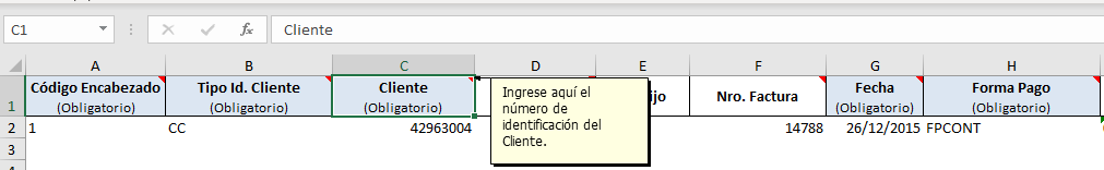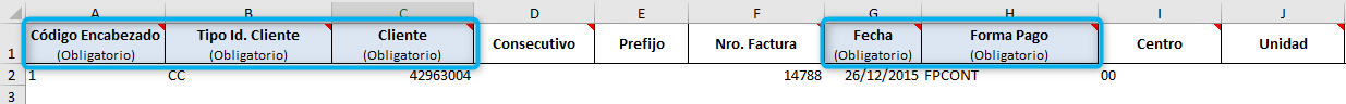 Código Encabezado: Hace referencia al número de documentos diferentes que vas a subir al sistema dentro de esta plantilla, se maneja en forma consecutiva - ascendente, usando un código por cada factura, 1, 2, 3, Etc...