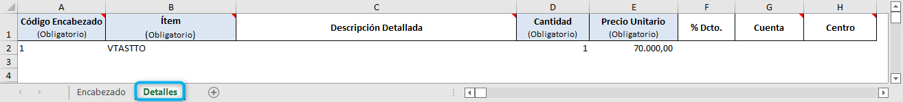 - Código Encabezado: Debe ser correspondiente con el código definido en la hoja de Encabezado por cada una de las facturas que van a importarse, en esta hoja puede repetirse este código si vas a indicar varios ítems para una misma factura.