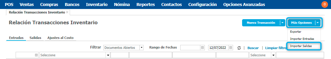 - Las salidas cargadas puedes verificarlas en Inventario → Relación de Transacciones Inventario, dando clic en la pestaña de Salidas y utilizando los diferentes filtros de consulta.