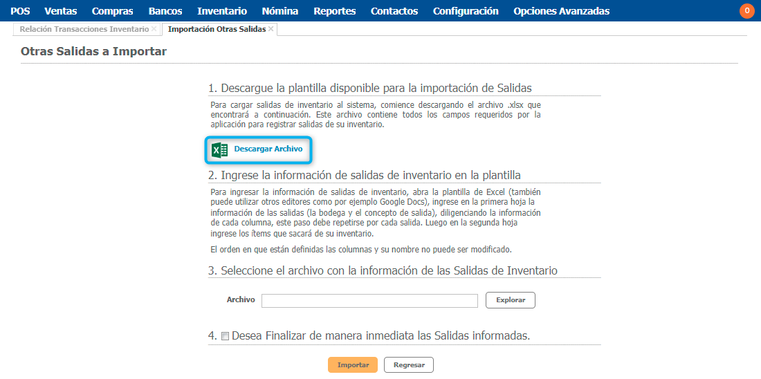 Para descargar la plantilla que te permitirá importar las otras salidas de inventario debes dirigirte a Inventario → Relación Transacciones Inventario