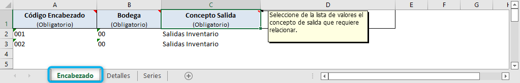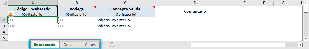 La plantilla cuenta con 3 hojas llamadas: Encabezado, Detalles y Series, en la cuales puedes encontrar los campos a diligenciar según tus necesidades de salidas de inventario.
