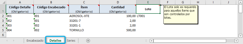 | Código Encabezado: Este hace referencia al código de la salida a la que pertenece el ítem del registro, debe coincidir con el ingresado en la hoja de encabezado. Ejemplo: Si solo es una salida con Código de Encabezado 001, en la hoja de Detalles para la columna de Código Encabezado debes establecer 001 por cada ítem de la salida. |