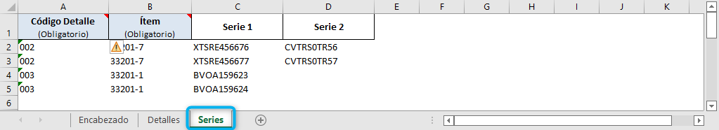 Si los ítems relacionados en la salida de inventario no tienen series debes borrar la información ejemplo de la plantilla, dejando en la hoja de Series los títulos de cada columna.