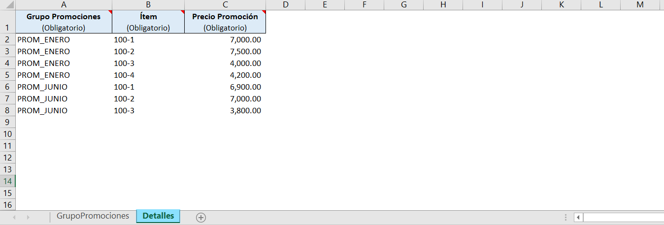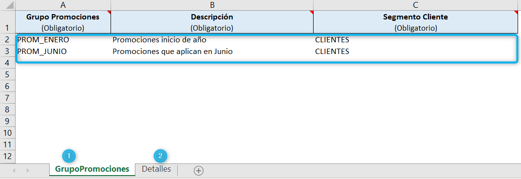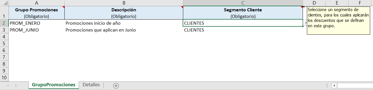 - Grupo Promociones: Ingresa en este campo el código o nombre del grupo de promociones al que pertenece el descuento del registro. (Debe coincidir con el nombre que indicaste en la pestaña GrupoPromociones)
