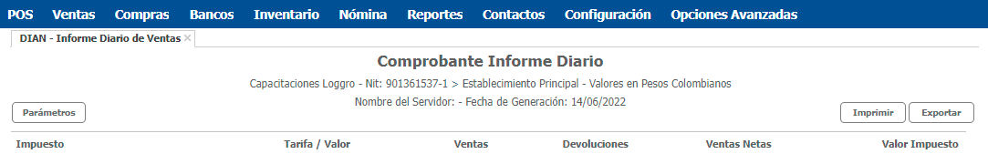 Ingresa por la ruta POS → DIAN – Informe diario de ventas o por la opción Reportes → DIAN – Informe diario de ventas