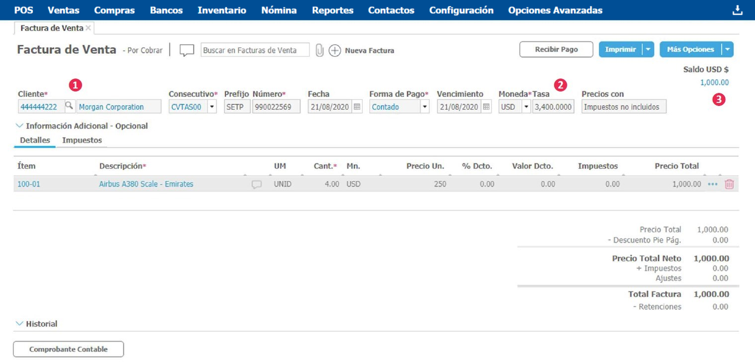 Al generar una factura de venta para un cliente ① y ser en moneda extranjera, recuerda que se debe informar la tasa de cambio en el documento ②, para este caso serian 3.400.