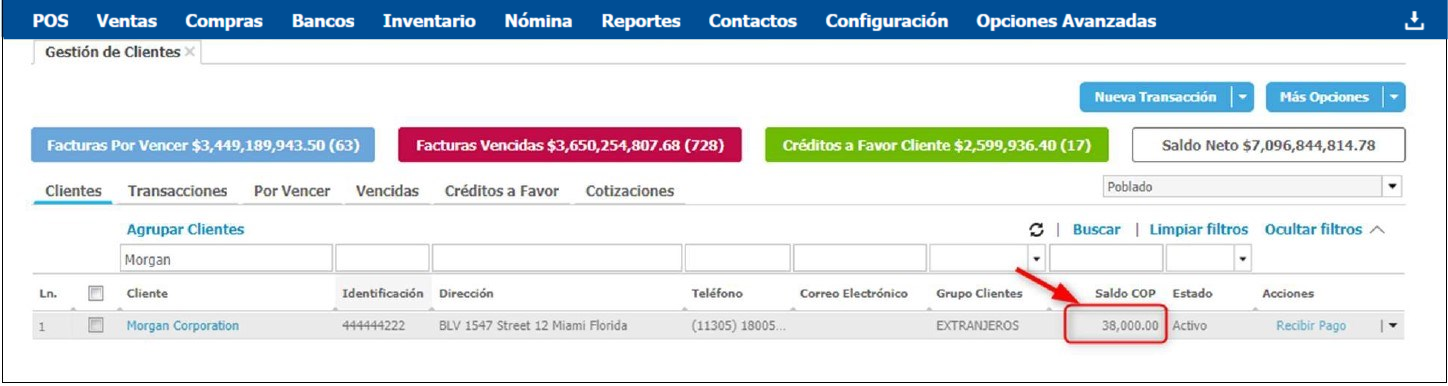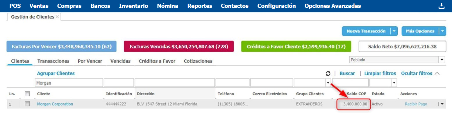 Al consultar el saldo en cartera para el cliente (Gestión de Clientes), puedes verificar este valor de la venta en moneda local (COP) → 3.400.000