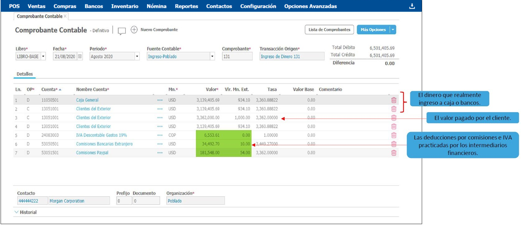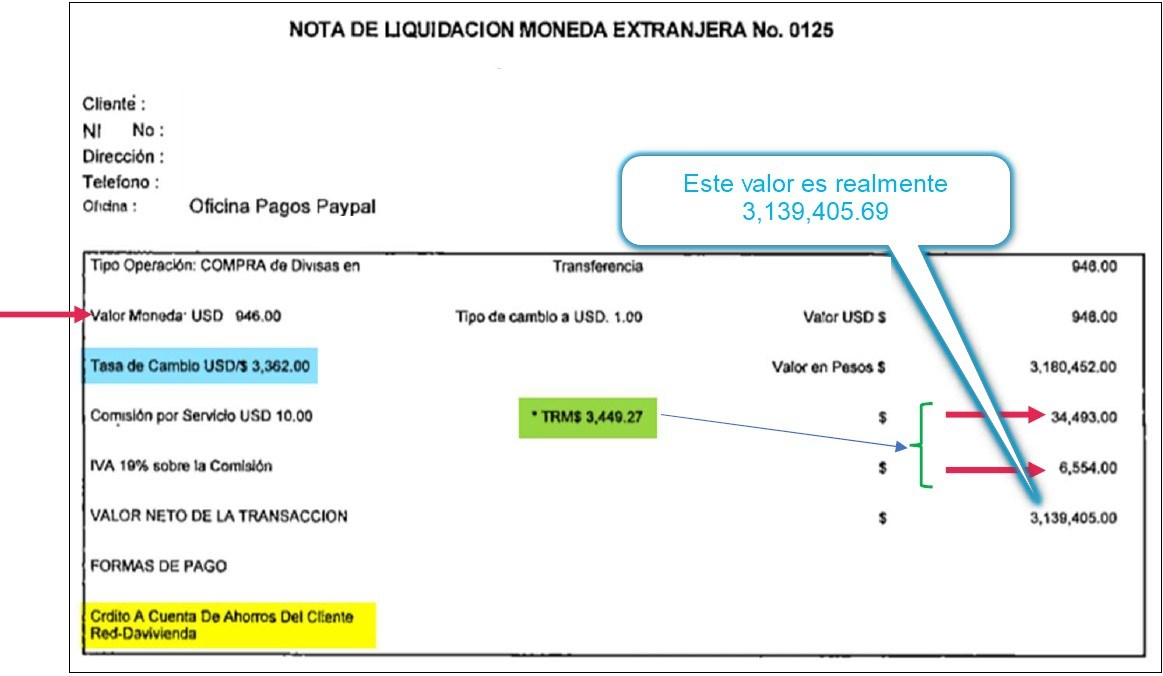Si el cliente nos genera el pago total de la factura por un valor de USD 1.000 a una tasa de cambio de 3.362 y la información que tenemos del pago con las comisiones es la siguiente: