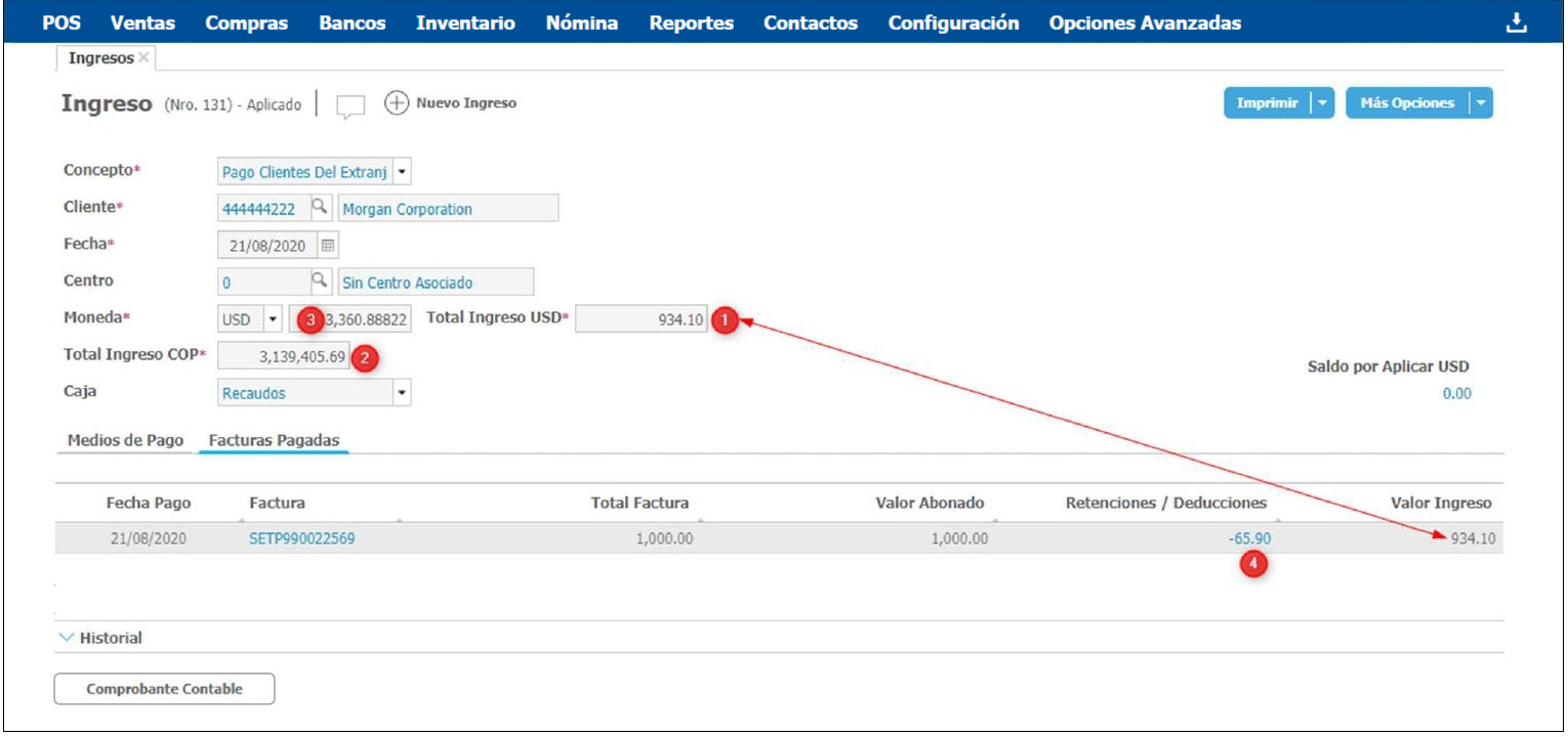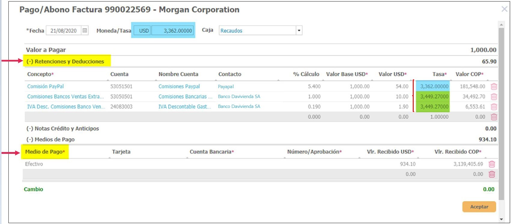 Con esta información tendríamos registrado el total de descuentos por comisiones de USD 65. - En la sección de Medios de Pago diligencias el total recibido por el pago, en este caso USD 934.10 que equivalen a COP 3,139,405.69