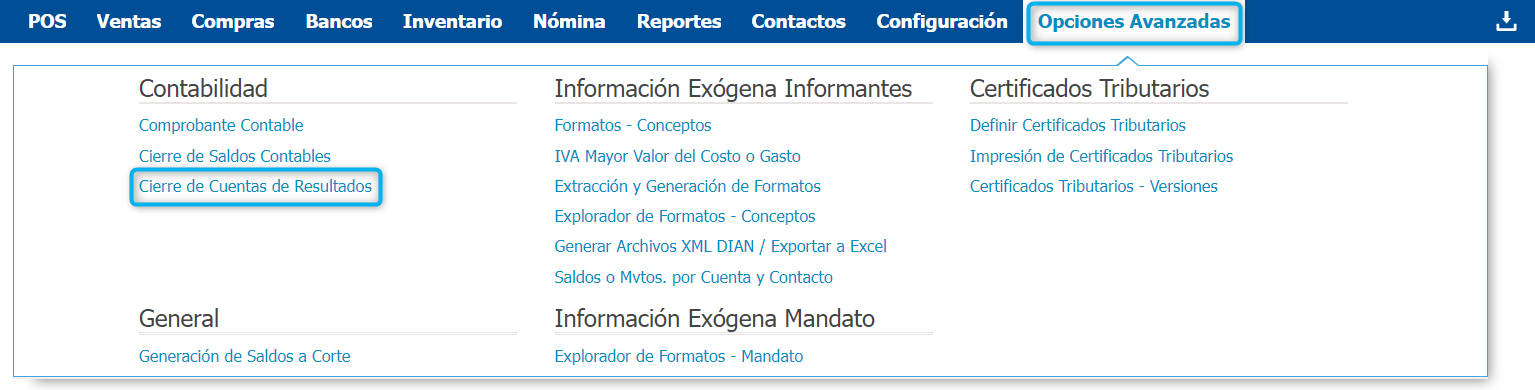 - Cierre de cuentas de resultados: Para acceder a esta pestaña ingresas en Opciones Avanzadas → Cierre de Cuentas de Resultados, esta opción permite cerrar las cuentas de resultados en libro base.