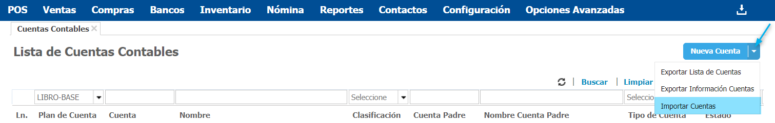 Para realizar la importación, debes ingresar a Configuración → Cuentas Contables, y desde allí debes dar clic en el botón Lista de Cuentas.