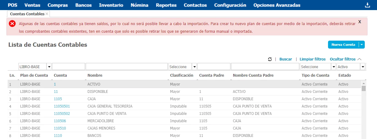 - Si ya tienes movimientos contables en el sistema, se mostrará un mensaje de error impidiendo la importación del plan de cuentas.