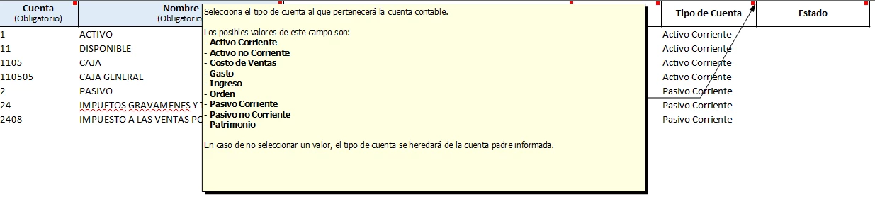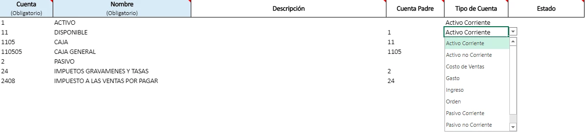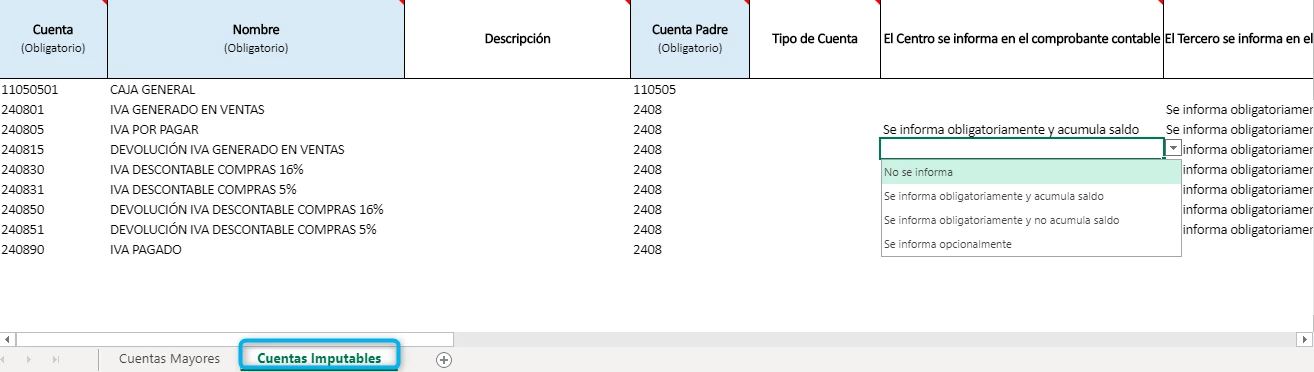 En el archivo de excel a diligenciar encuentras dos pestañas diferentes donde debes definir tanto las Cuentas Mayores como Cuentas Imputables.