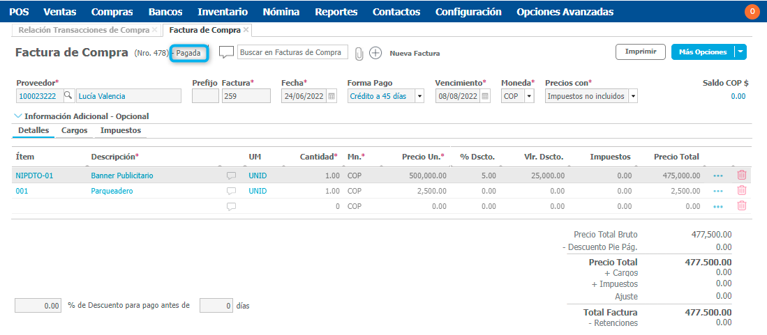 El sistema trae automáticamente la información de la factura de compra incluyendo el saldo y podrás modificar los campos de: