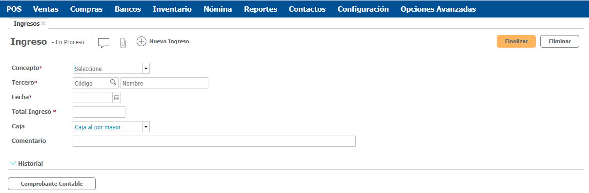 Finalizar o terminar el proceso del ingreso de dinero y Eliminar la información que has diligenciado. La opción de eliminar solo puede usarse cuando el ingreso se encuentra en estado En Proceso.