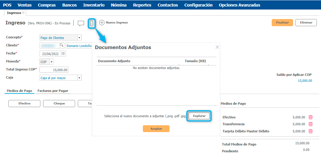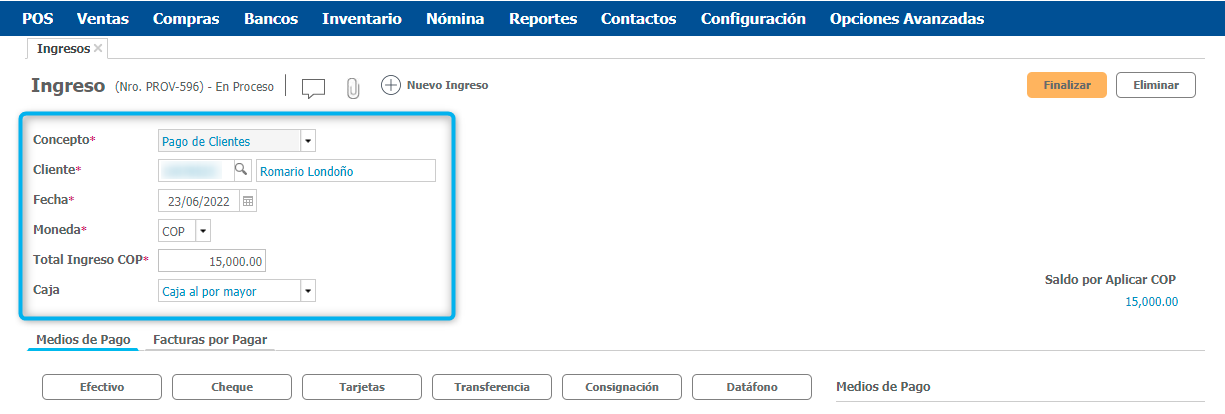 Luego de terminar el encabezado del ingreso y teniendo en cuenta: el cliente, el concepto de ingreso y el valor, se habilita en la parte inferior la opción para definir los diferentes Medios de Pago.