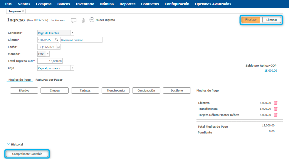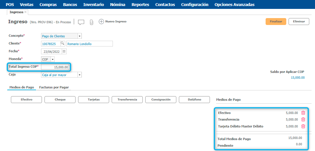 Puedes usar uno solo o varios de estos, la suma de valores en los medios de pago debe coincidir con el valor total del ingreso indicado en el encabezado. En la sección derecha el sistema te va totalizando los valores ingresados por medio de pago y si tienes algún saldo pendiente también se relacionará.