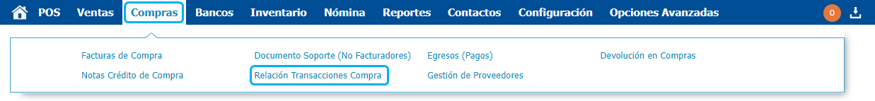 Para realizarlo debes ingresar a Compras → Relación Transacciones Compras