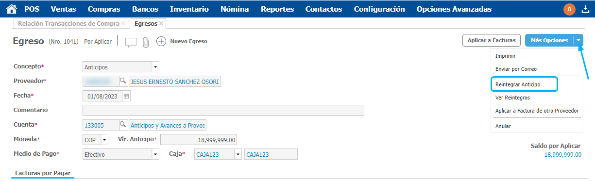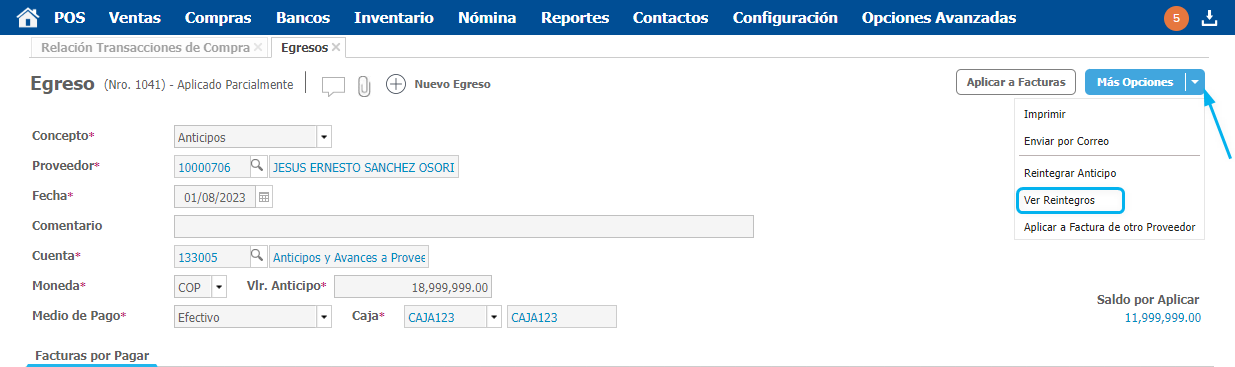 Se abre una nueva ventana con los datos del egreso, vas a dar clic en Mas Opciones, posteriormente seleccionas Reintegrar Anticipo.