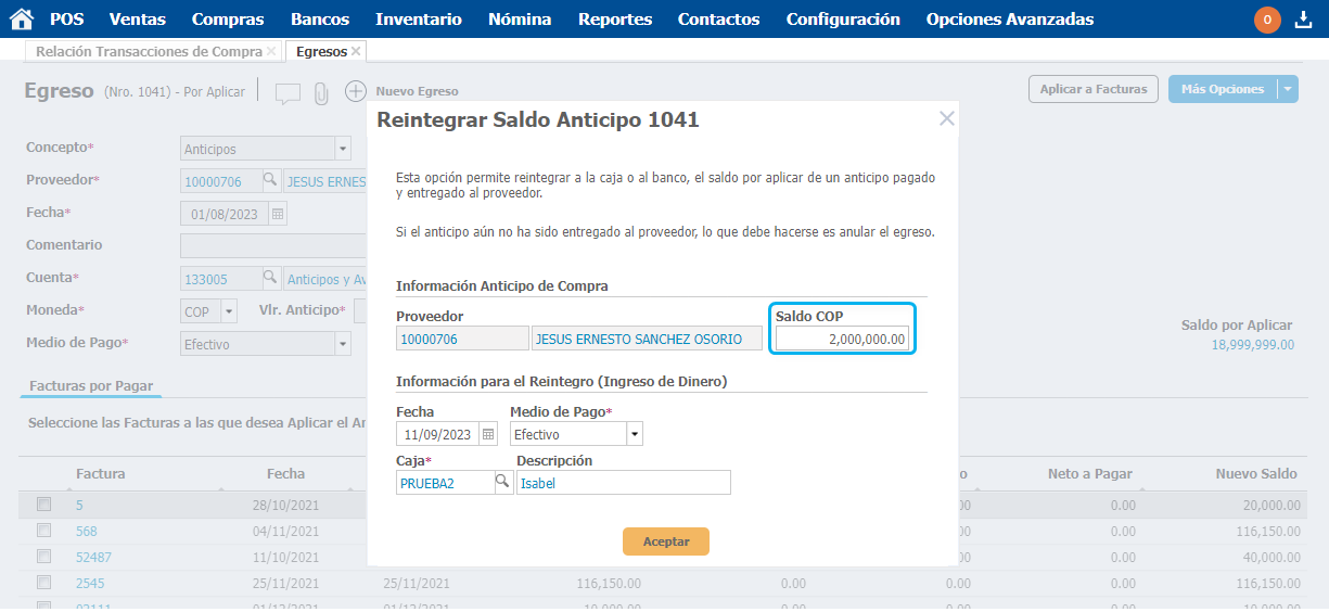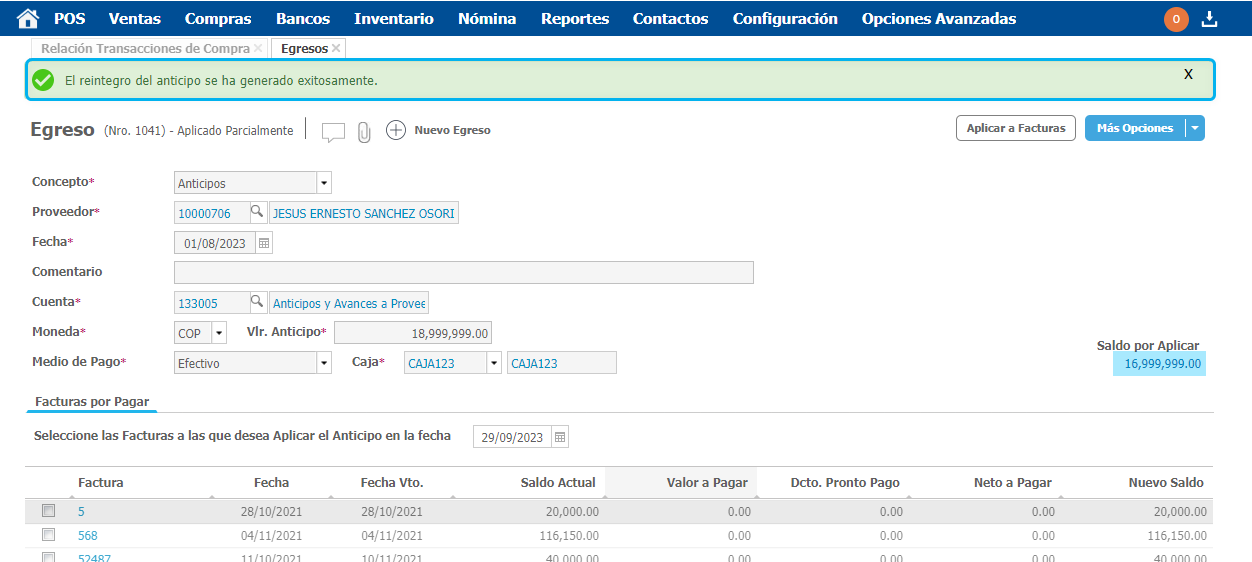 Ahora Loggro te permite reintegrar parcialmente un anticipo realizado a tus proveedores.