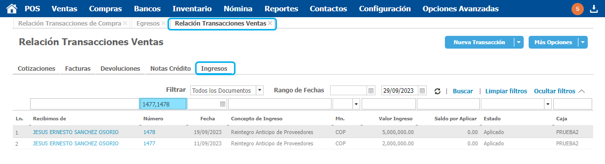Al dar clic en esta opción el sistema nos abre una nueva ventana donde relaciona los ingresos realizados.