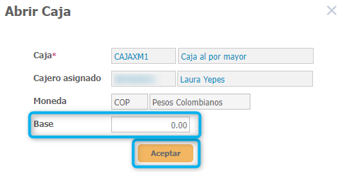 Cuando abres una caja desde la ventana Gestión de Cajas, el sistema te muestra una nueva ventana donde puedes informar una Base en caso de manejarla.